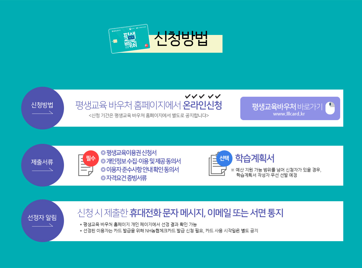 신청은 온라인으로 이루어집니다. 평생학습 바우처 공식 홈페이지에 접속하여 신청할 수 있습니다.